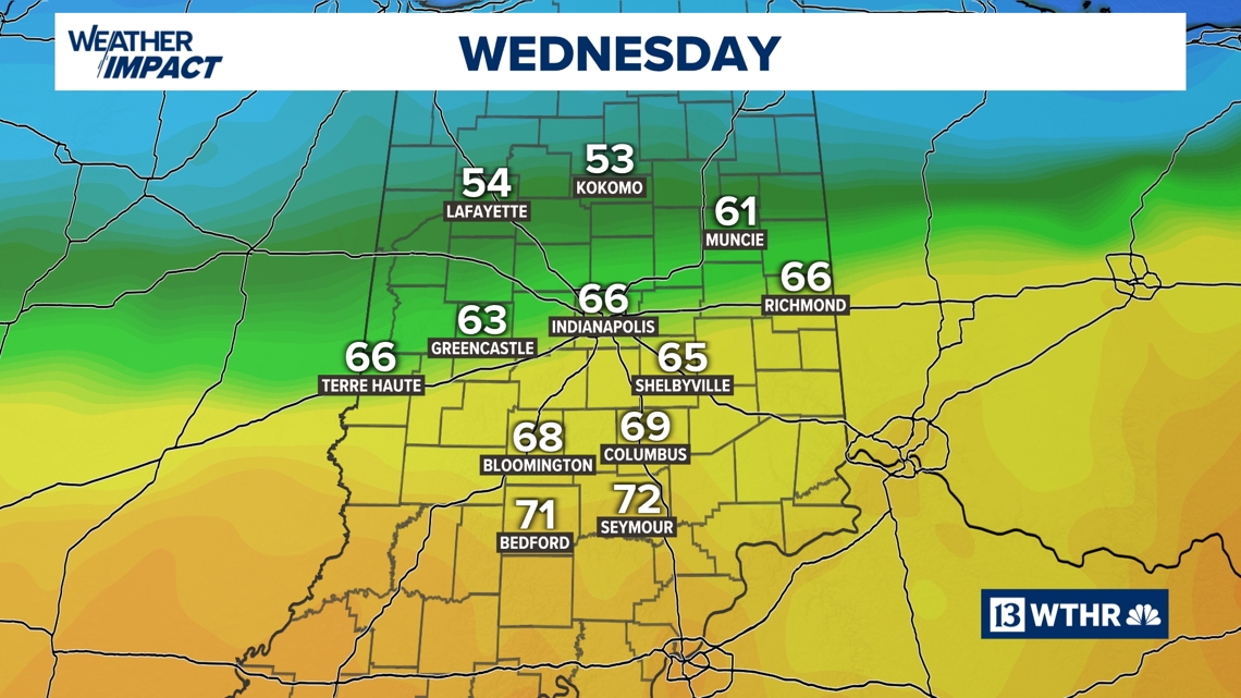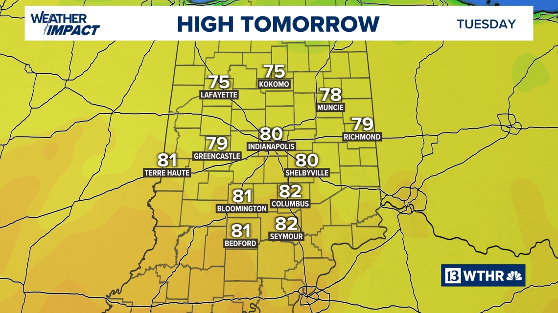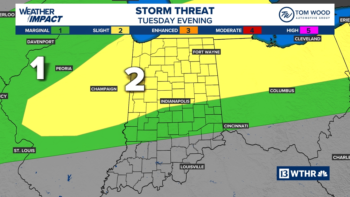Some dry time is within the forecast early Tuesday, forward of scattered showers and storms growing throughout northern Indiana. There is a low danger of extreme climate from Indianapolis north later Tuesday into early Wednesday.